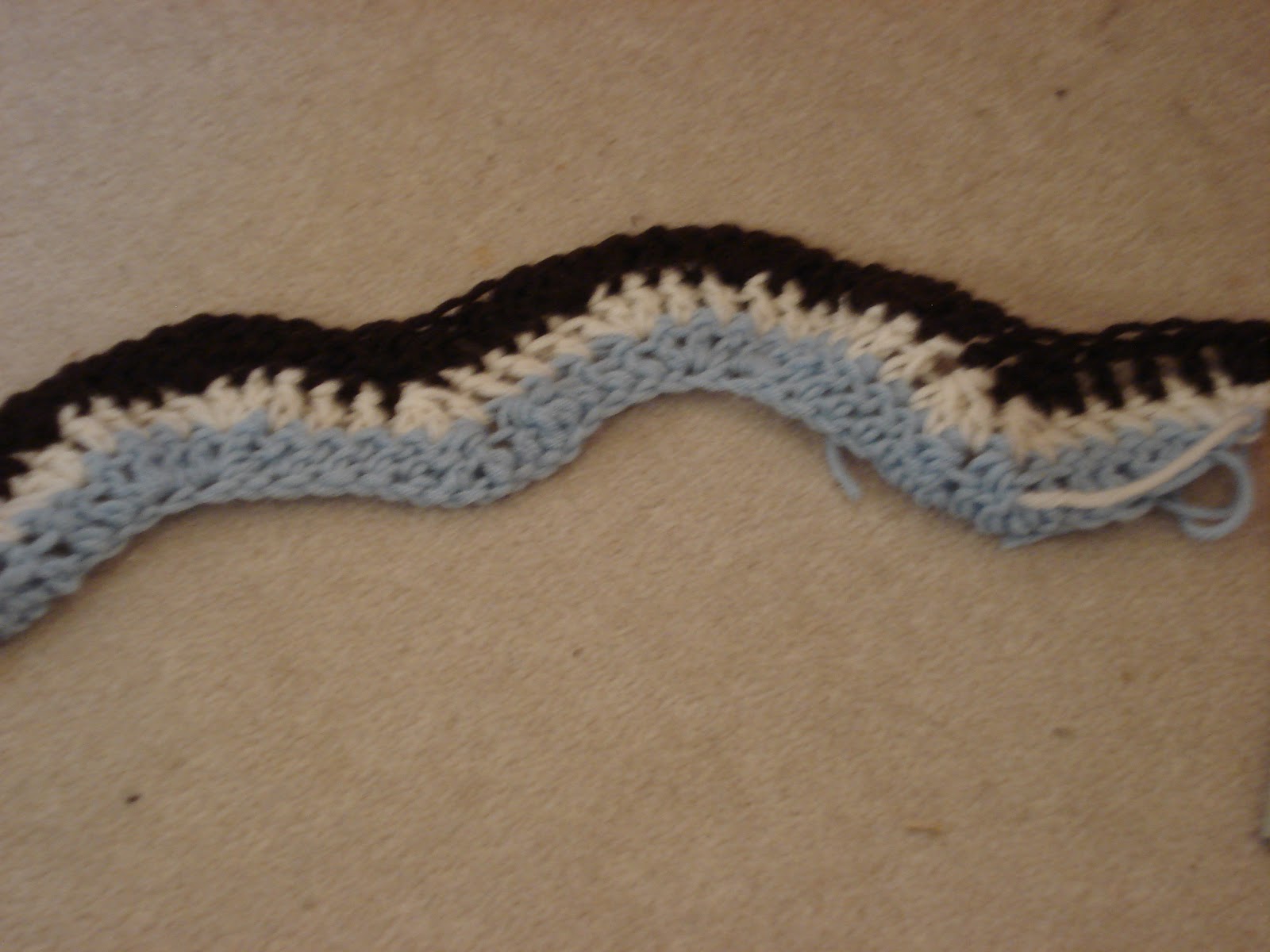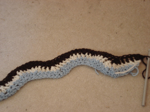 My violin tutor has just become a dad for the first time and a week ago was searching for possible names for his new baby girl. Knowing his wife is a native Quebecian, I suggested Aimee (with accents) which has french roots and means ‘beloved’ which I though was lovely, and the more british Clara (I didn’t know the meaning, I just liked the name, but apprently it means bright/famous and has latin origins). I added a note at the end that they were just the names I liked and I’m sure they would receive many other suggestions. To my delight I received an email back this week saying they had chosen Emmaline as a first name but Clara as a middle name! So I thought in the absence of cuddling her I’d make her a blanket. I bought the wool (originally I wanted purple or a yellow, but there were no colours in this super soft yarn that I liked). I know blue, cream and brown are maybe though of as boys colours because of the blue but I’m sure Emmaline can carry it off. I’m still a bit undecided about the pattern though, originally I had my heart set on this wave pattern but now 1 repeat in its starting to curl like crazy (I don’t know if that’s my fault for crocheting too tight or if there just isn’t enough yarn there to weigh it down yet). I’m tempted to rip it back and just do a straight blanket (there being time pressures as well). What do you think?