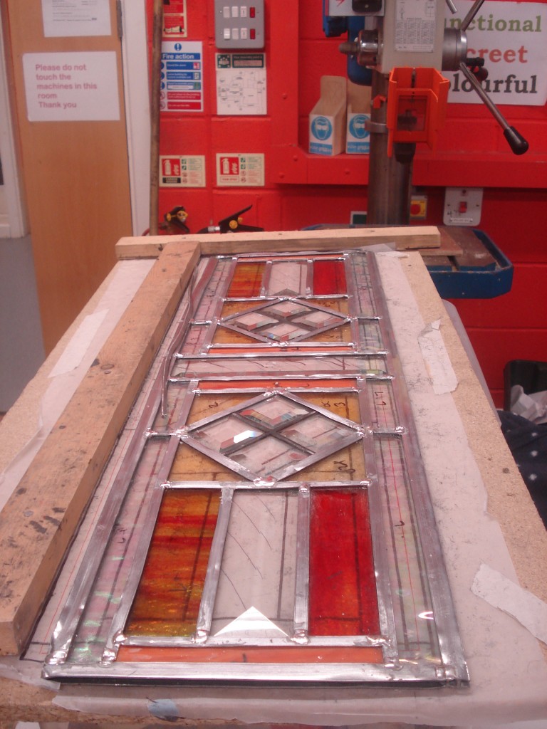 I had cut all the pieces but the glass had marks all over it where it looked to have been etched into. Not good. I had selected the water glass for the petals so the lines would flow out (in patchwork I guess you’d call this fussy cutting) so I had to pick out another bit of glass where these lines were strong. Fortunately on the second attempt the glass remained unscratched and I was able to copper foil the lilly and get it soldered together. While I was doing this other members of my class were making storming progress. Vicky finished her panel (the pictures don’t do this justice, its stunning)