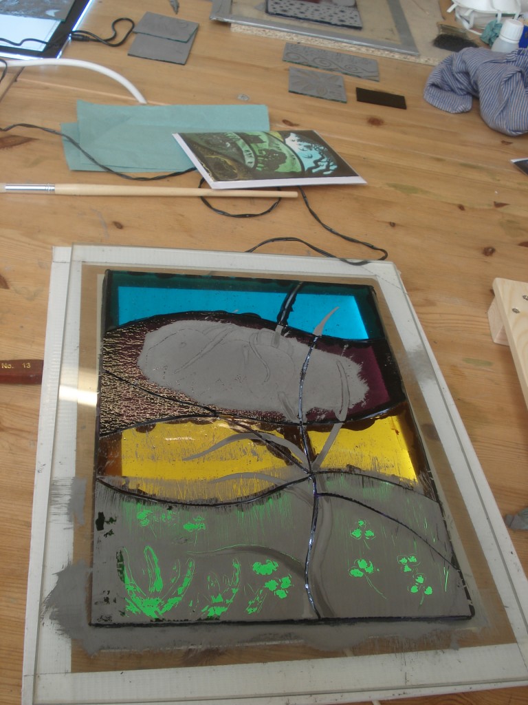 That night we left our glass at Ardington for Nicola to take home and fire in her kiln and the next morning I was able to get a sense of what my finished piece would look like (Nicola introduced us to the idea of using a blank piece of glass as an easel and to stick our glass pieces to using play do!).