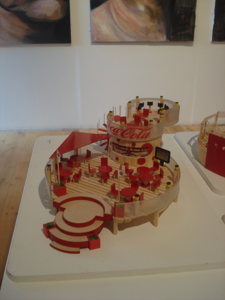 In the back of the gallery were some models for a themed Coca Cola bar that the students had to design using 3D modelling and then make using found materials (the decking is lollypop sticks), make (the wood parts were hand sawn) and 3D printing (the stairs, canopies and seating) . Here’s Hannah’s – I think we can agree that even if you are not fortunate enough to be related to her she has a flair for design!