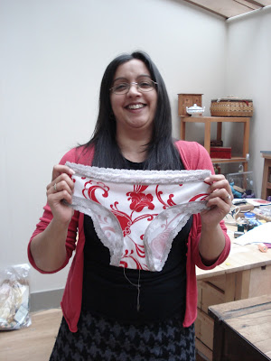 Fortunately Emma was there to help me (and sewed a few of the problem sections for me, thank you Emma) and Inma from the old school club appeared with more tea and cake. Many hours later and my deskmates had finished theirs ad I had these crackers (loving held up by Emma – yes she is that wonderful, I have now independently verified this!). I had a really great time on the course, I’m definitely going to order some of the kits (and you can too from here) to give the other patterns a try (and maybe try the short in a more sewing friendly different material? Just to see if its any easier (although I’m thrilled with the result and hopefully on my own machine I’ll find it slightly easier than with a machine I didn’t know). Emma was the most fantastic teacher, in the world ever (I was its fair to say a bit starstruck in her presence, what she is doing & the ethics and sentiment behind it are so awesome) I’m hoping I will be able to do another course with her at some point but until then I have my beautiful knickers to remind of a very special valentines day!