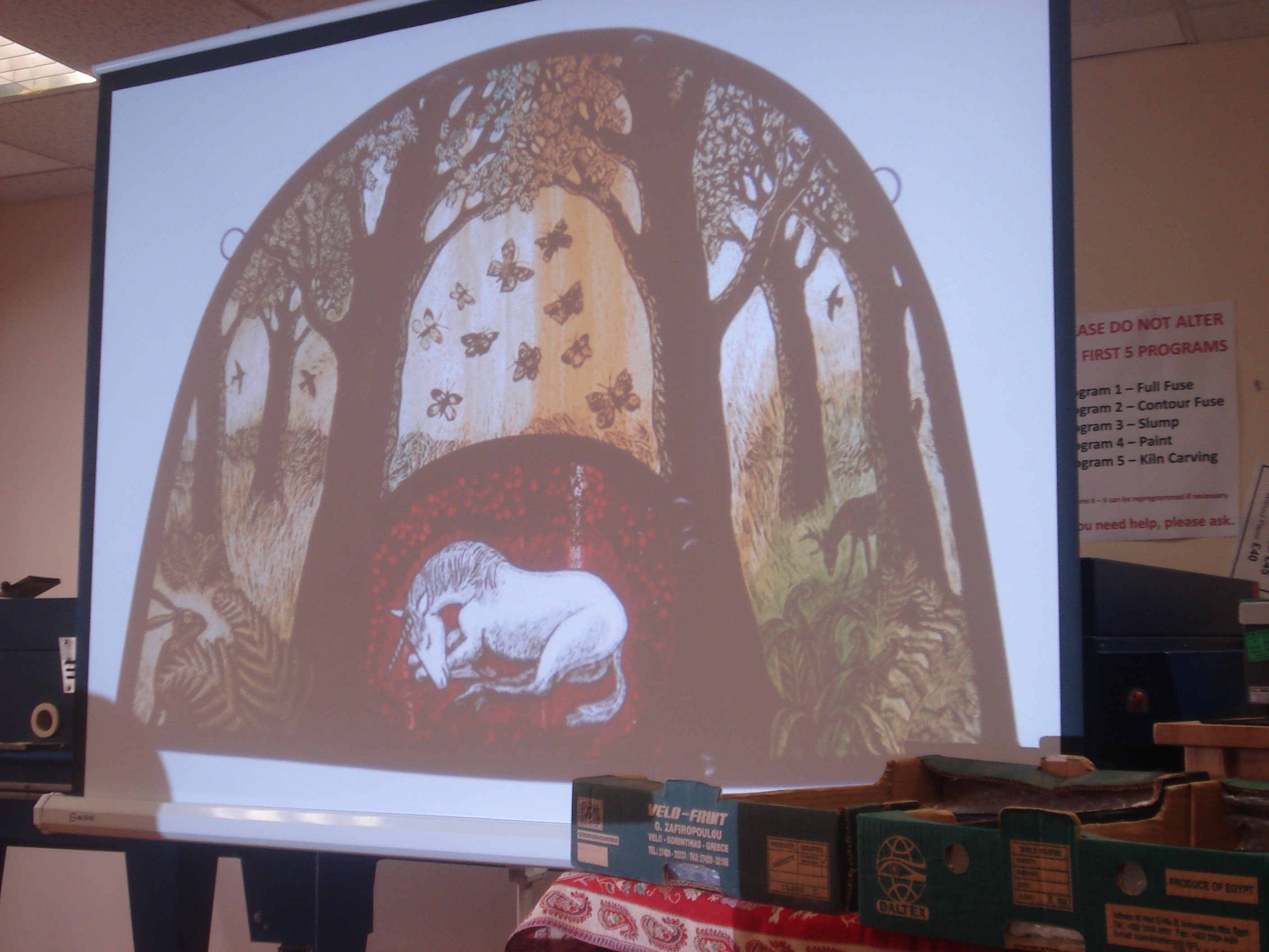 Massive thank you’s to Tamsin for being such an amazing and engaging speaker (and for putting up with me clicking away) and creative glass guild for hosting. I leave you with one of my absolute favorite pieces from the presentation (quite different to a lot of the other panels and there was an audible gasp when it went up – the rendering of the light is amazing and really gives it a sense of drama).